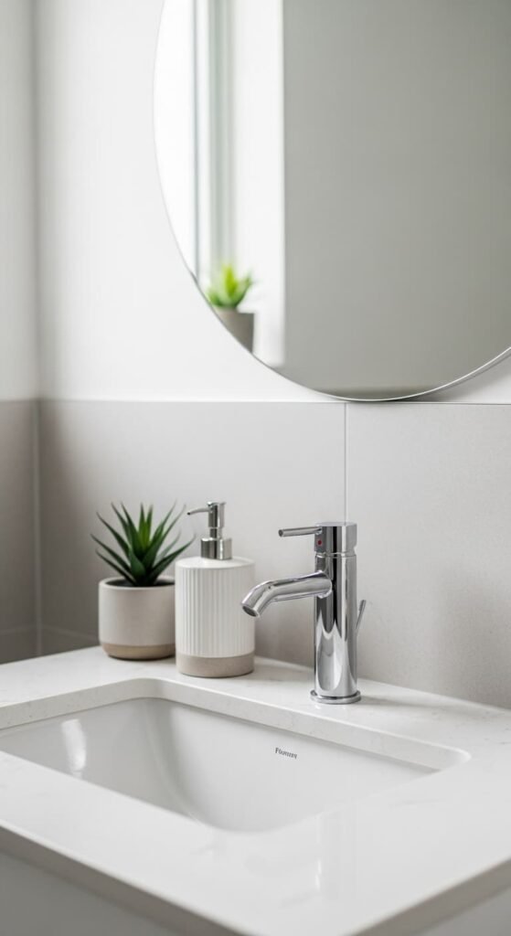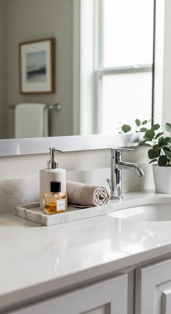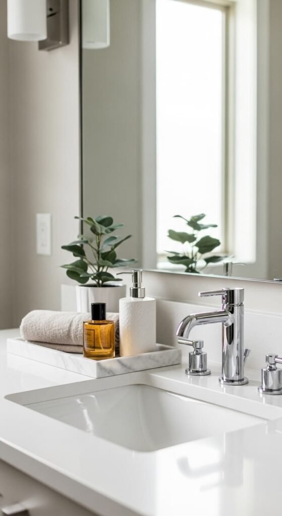 A minimalist tray setup instantly makes a bathroom counter look organized and stylish. A sleek marble or wooden tray holds essentials like a soap dispenser, perfume bottle, and small plant. This arrangement keeps the counter clutter-free while adding a sophisticated touch. Neutral colors and simple accessories create a calm, spa-like atmosphere perfect for modern bathrooms.