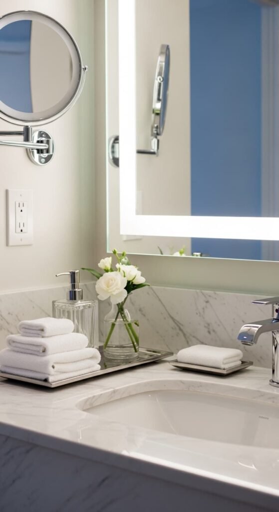 Hotel-inspired counters focus on elegance and simplicity. Neatly folded towels, a soap dispenser, and a decorative tray create a polished look. The clean arrangement feels luxurious and relaxing. Neutral colors and minimal accessories ensure the counter remains tidy while still looking stylish and inviting for everyday use.