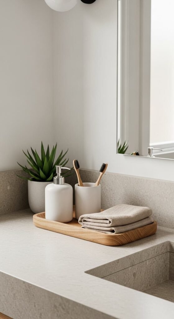 Wooden accessories add warmth and natural texture to bathroom counters. A wooden tray or soap dish paired with neutral containers creates a balanced and cozy look. This decor style works well in modern farmhouse or Scandinavian bathrooms. The natural wood tone contrasts beautifully with white sinks and stone countertops for a welcoming design.