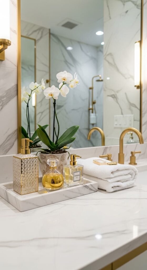 A luxury marble counter display creates a high-end bathroom look. Decorative marble trays, gold accessories, and stylish bottles instantly elevate the space. This elegant setup blends sophistication with practicality, keeping essentials organized while looking beautiful. Adding subtle lighting and polished materials enhances the luxurious feel and creates a hotel-inspired bathroom design.