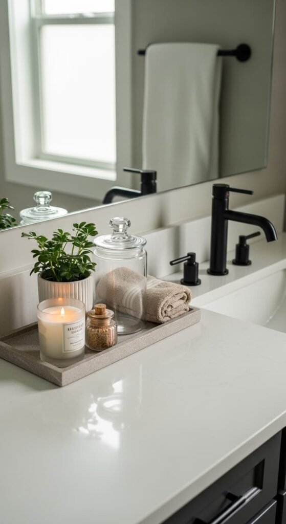 Layering decor items on a tray creates a visually appealing bathroom counter. Combine candles, small plants, and jars in varying heights to add depth. This styling technique makes everyday items look like intentional decor. It works especially well in modern bathrooms where simple elements can create a stylish focal point.