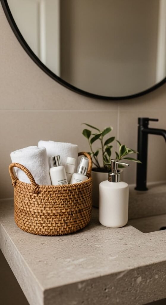 Small woven baskets add both storage and charm to bathroom counters. They can hold hand towels, skincare products, or toiletries while keeping everything tidy. Natural textures like wicker or rattan bring warmth and balance to modern bathrooms. This idea works especially well in cozy or boho-style interiors.