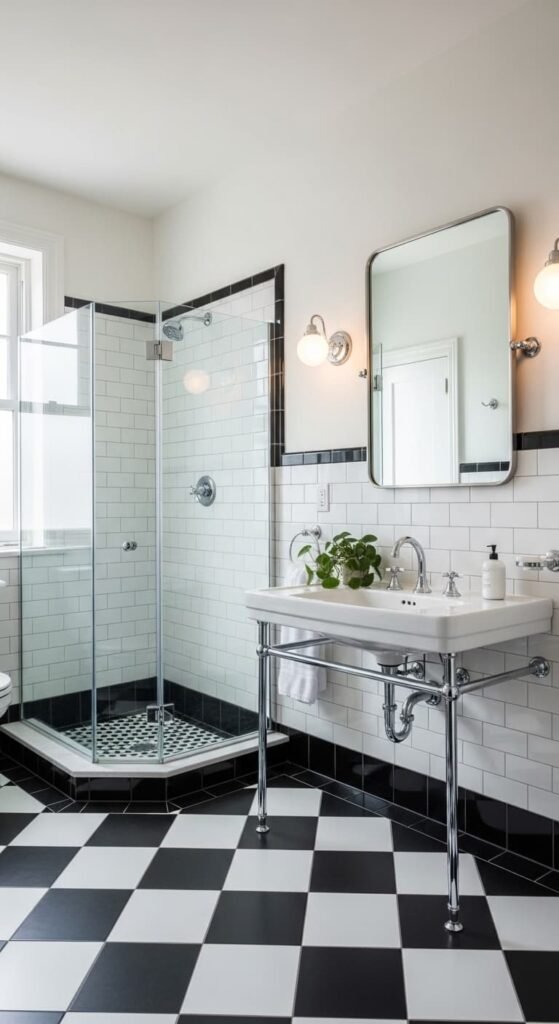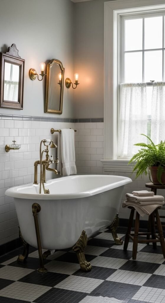 Black and white checkerboard flooring is a timeless vintage bathroom feature. The bold pattern instantly creates character while maintaining classic elegance. Pair it with white walls, chrome fixtures, and a pedestal sink for a balanced look. Add vintage lighting and framed art to soften the contrast and create a sophisticated retro-inspired bathroom atmosphere.