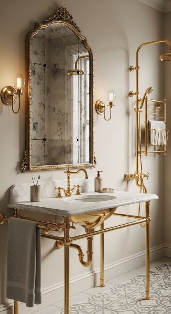 Brass fixtures add warmth and elegance to a vintage bathroom design. Golden faucets, towel bars, and showerheads create a luxurious old-world aesthetic. Combined with marble countertops, neutral tiles, and antique mirrors, brass details instantly elevate the room. The result is a sophisticated bathroom that blends vintage beauty with modern comfort.