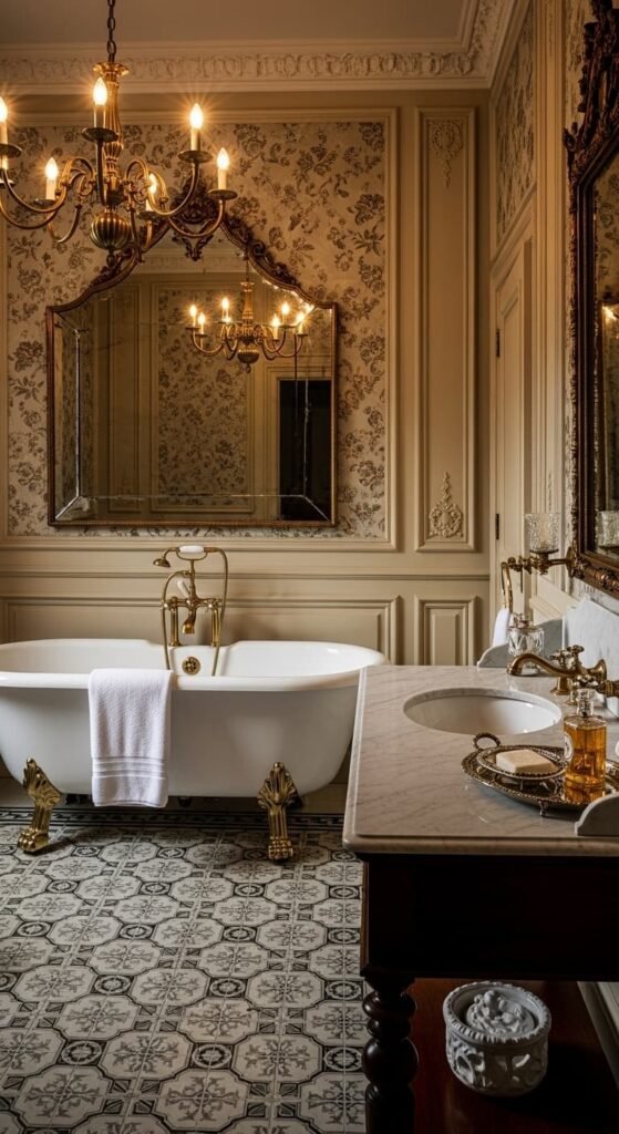 Victorian style bathrooms embrace ornate details and rich textures. Decorative molding, antique mirrors, and intricate fixtures create a luxurious vintage atmosphere. A clawfoot tub, patterned wallpaper, and elegant lighting add dramatic character. This design style celebrates classic craftsmanship and transforms the bathroom into a sophisticated historical space.