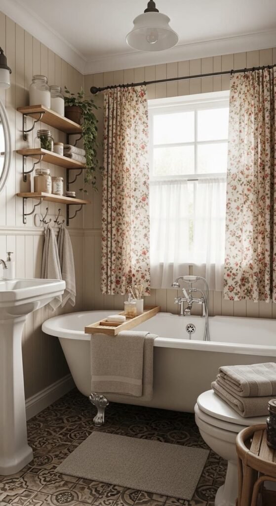 Cottagecore vintage bathrooms focus on comfort and charm. Soft pastel walls, floral fabrics, and wooden accents create a cozy countryside feel. A small clawfoot tub or farmhouse sink enhances the nostalgic aesthetic. With plants, vintage baskets, and linen curtains, the bathroom becomes a peaceful retreat inspired by rustic cottages.