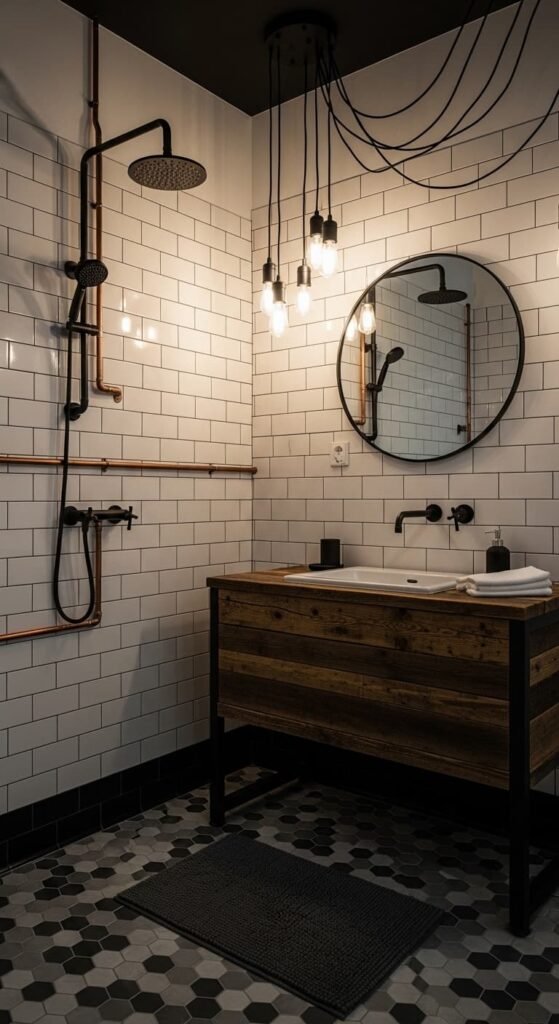 Vintage industrial bathrooms combine raw materials with retro charm. Exposed pipes, subway tiles, and dark metal fixtures create a bold yet stylish design. Paired with wooden accents and antique lighting, the space feels both rugged and nostalgic. This style works well for modern homes wanting vintage character.