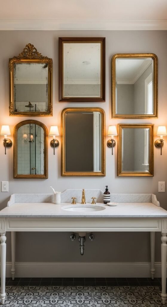 A gallery wall of antique mirrors creates a stunning vintage bathroom aesthetic. Different shapes and ornate frames add character and visual depth. Combined with soft lighting and classic fixtures, the mirrors reflect light beautifully and make the bathroom appear larger. This design blends elegance and artistic personality.