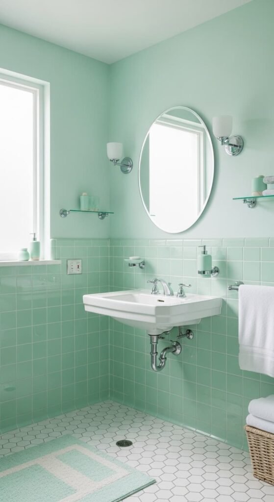 Retro pastel tiles bring a playful vintage aesthetic to the bathroom. Soft shades like mint green, baby blue, or blush pink create a cheerful nostalgic look reminiscent of mid-century homes. Pair pastel tiles with chrome fixtures, a rounded mirror, and white cabinetry. The result is a bright and charming bathroom that balances vintage personality with clean modern simplicity