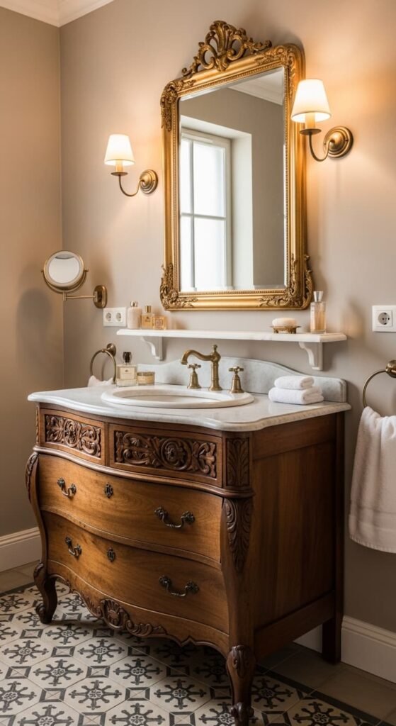 An antique wooden vanity transforms a bathroom into a refined vintage retreat. Intricate carvings, aged wood textures, and marble countertops create a sense of history and craftsmanship. Paired with brass faucets, oval mirrors, and soft wall lighting, the vanity becomes the centerpiece of the room. This design blends elegance and practicality while maintaining a warm nostalgic atmosphere.