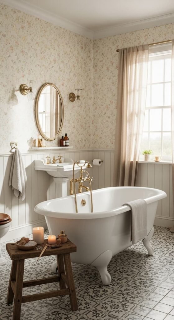 Floral wallpaper adds softness and romantic charm to a vintage bathroom aesthetic. Delicate botanical patterns in muted colors create a cozy nostalgic feel. When paired with a clawfoot tub, brass fixtures, and wooden accents, the room becomes a warm and inviting retreat. This style works especially well for cottage or shabby chic inspired bathrooms.