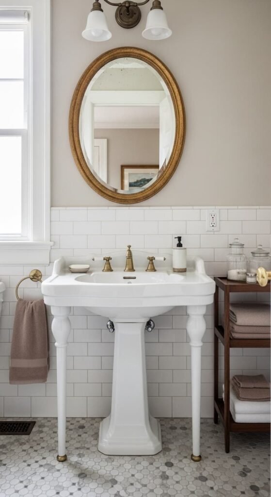 A pedestal sink is one of the most recognizable vintage bathroom elements. Its simple yet elegant design keeps the space feeling light and open. Paired with classic subway tiles, brass hardware, and a decorative mirror, the sink becomes a timeless focal point. This style works beautifully in small bathrooms seeking vintage charm.