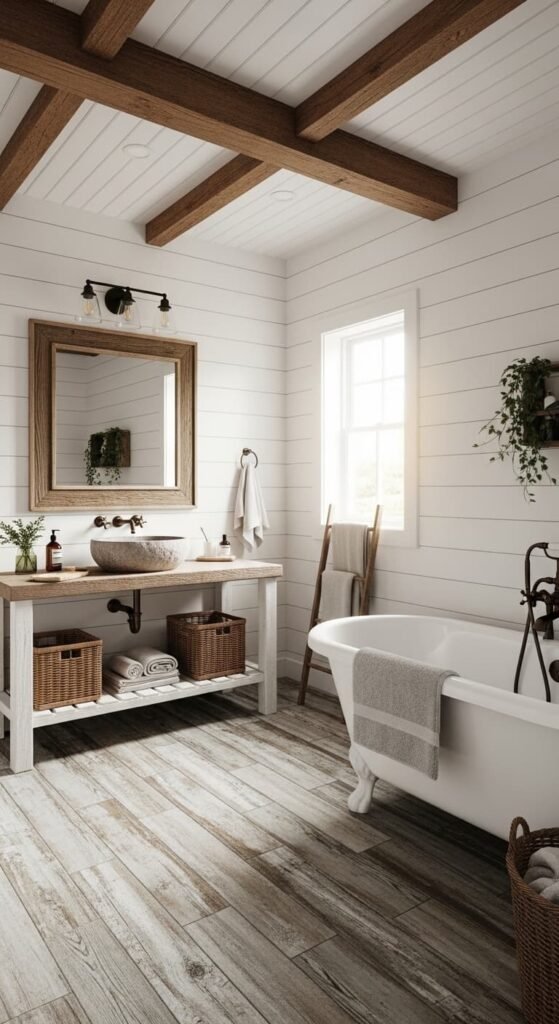A rustic farmhouse vintage bathroom blends old-world charm with natural textures. Wooden beams, shiplap walls, and vintage lighting create a cozy countryside atmosphere. A freestanding bathtub and bronze fixtures complete the look. With woven baskets and greenery, the space feels warm, welcoming, and timeless while maintaining the classic vintage aesthetic.