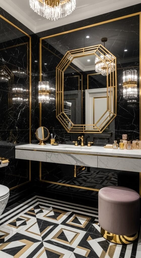 Art Deco bathrooms combine vintage style with bold geometric elegance. Black marble, gold accents, and symmetrical shapes create a glamorous atmosphere reminiscent of the 1920s. Pair geometric floor tiles with a gold-framed mirror and sleek vanity lighting. The result is a luxurious vintage bathroom that feels dramatic yet timeless.