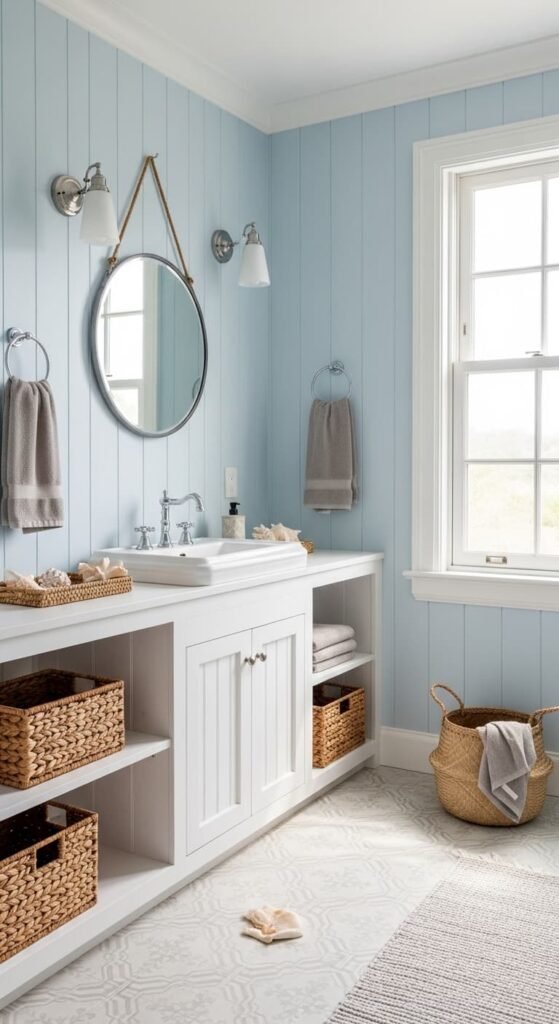 A vintage coastal bathroom blends seaside serenity with retro charm. Soft blue and sandy tones create a calming atmosphere reminiscent of beach cottages. Pair vintage mirrors, woven baskets, and white cabinetry with nautical accents. The result is a bright, airy bathroom that feels relaxing while maintaining a nostalgic vintage aesthetic