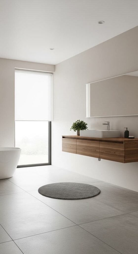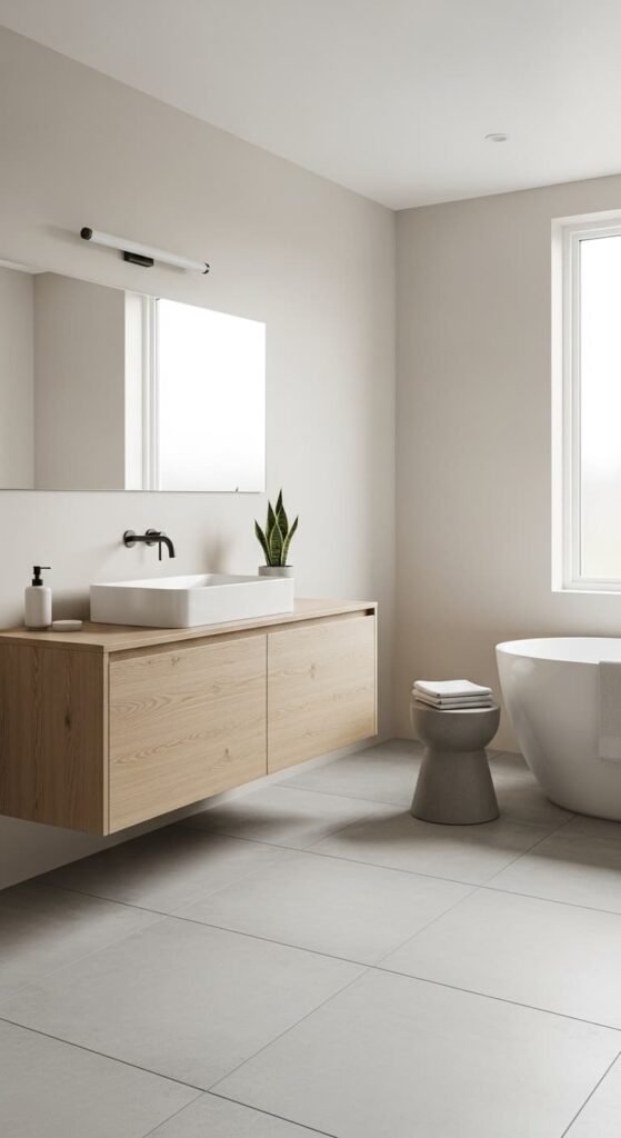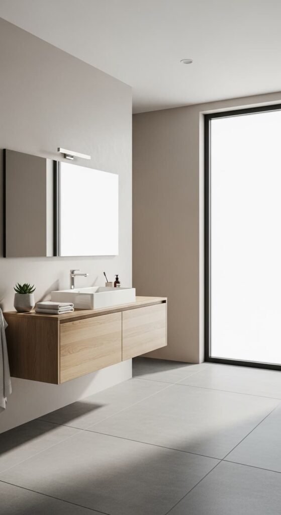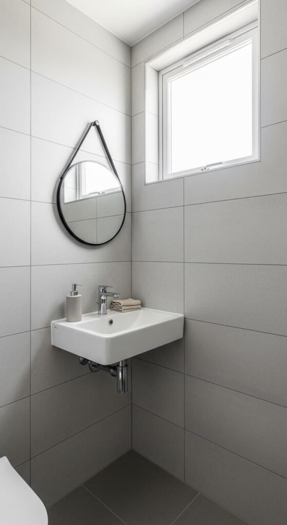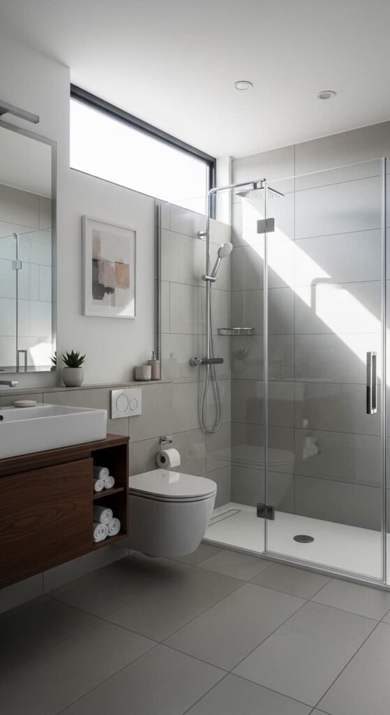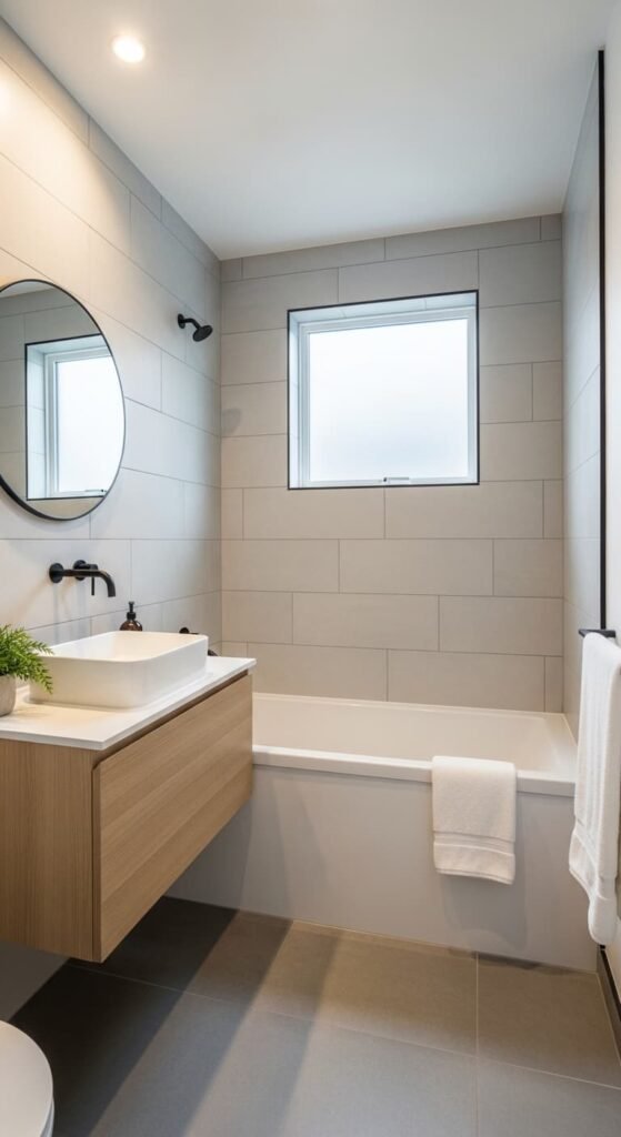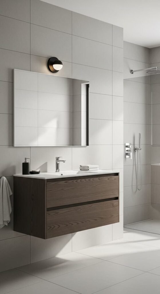Large-format tiles reduce grout lines, creating a cleaner and more spacious look. This modern technique enhances visual continuity and makes small bathrooms feel bigger.