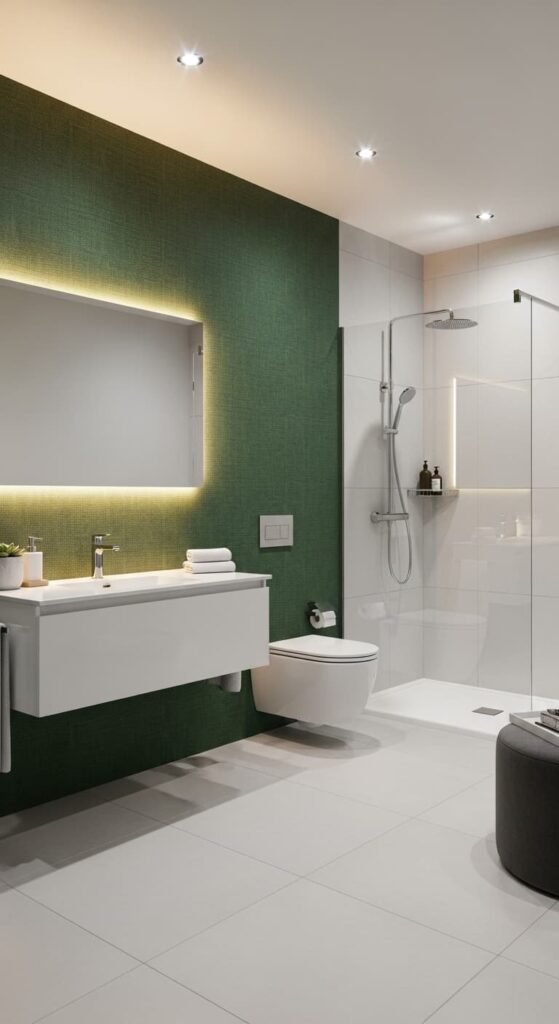 Adding one bold accent wall creates visual interest without overwhelming the space. It adds personality while keeping the rest of the bathroom light and open.