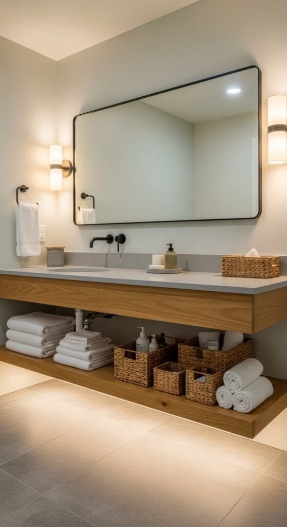 A floating vanity is a smart solution for small bathrooms, creating visible floor space that makes the room feel larger. Its sleek design adds a modern touch while providing storage underneath. Combined with a simple mirror and soft lighting, this idea keeps the space uncluttered and visually open.