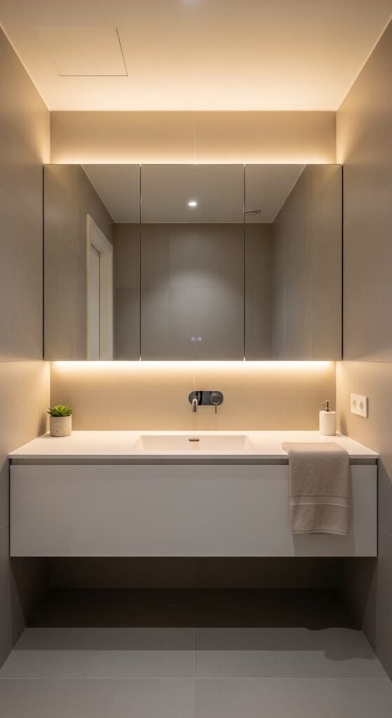LED lighting improves both functionality and ambiance in small bathrooms. Backlit mirrors and under-cabinet lighting create depth and highlight modern design features, making the space feel larger.