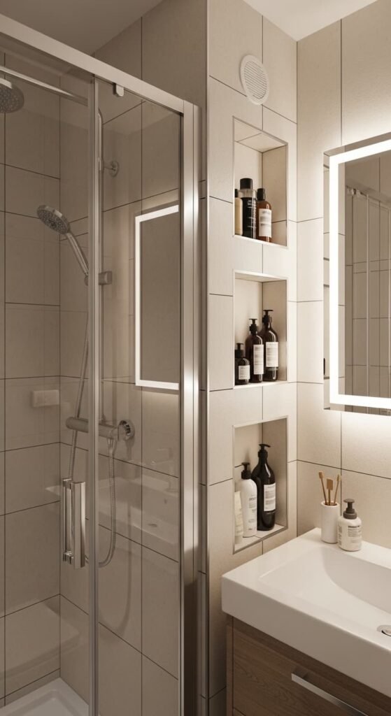 Built-in wall niches provide storage without taking up extra space. They keep toiletries organized while maintaining a clean, uncluttered look. This design is ideal for modern bathrooms where simplicity and functionality are key.