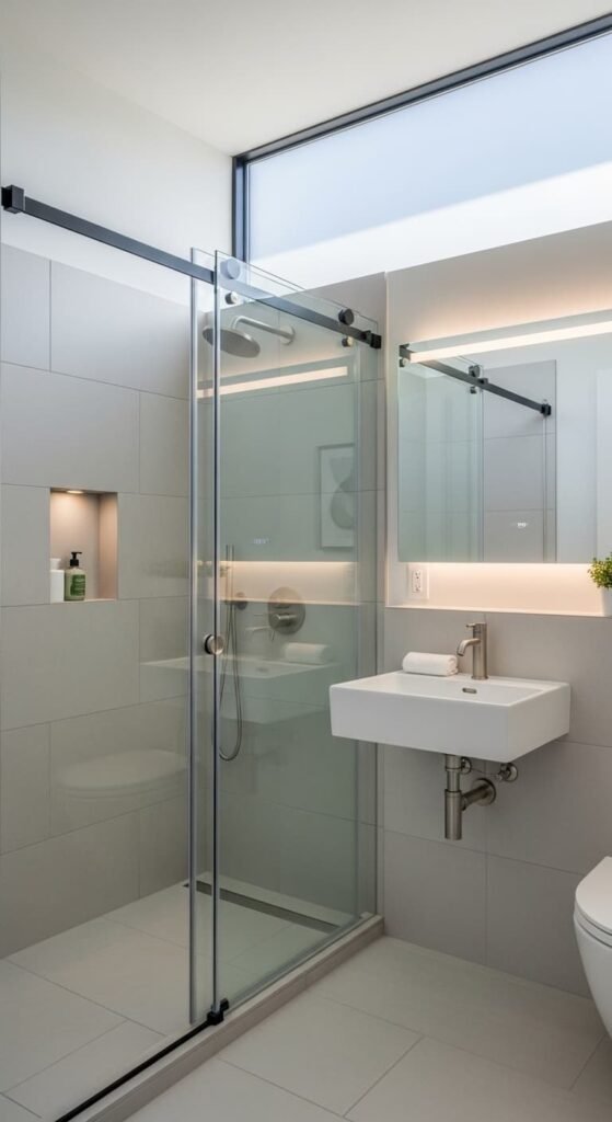 Sliding shower doors save space compared to traditional swing doors. They are practical for tight layouts while maintaining a modern look. Paired with glass panels, they keep the bathroom feeling open and uncluttered.