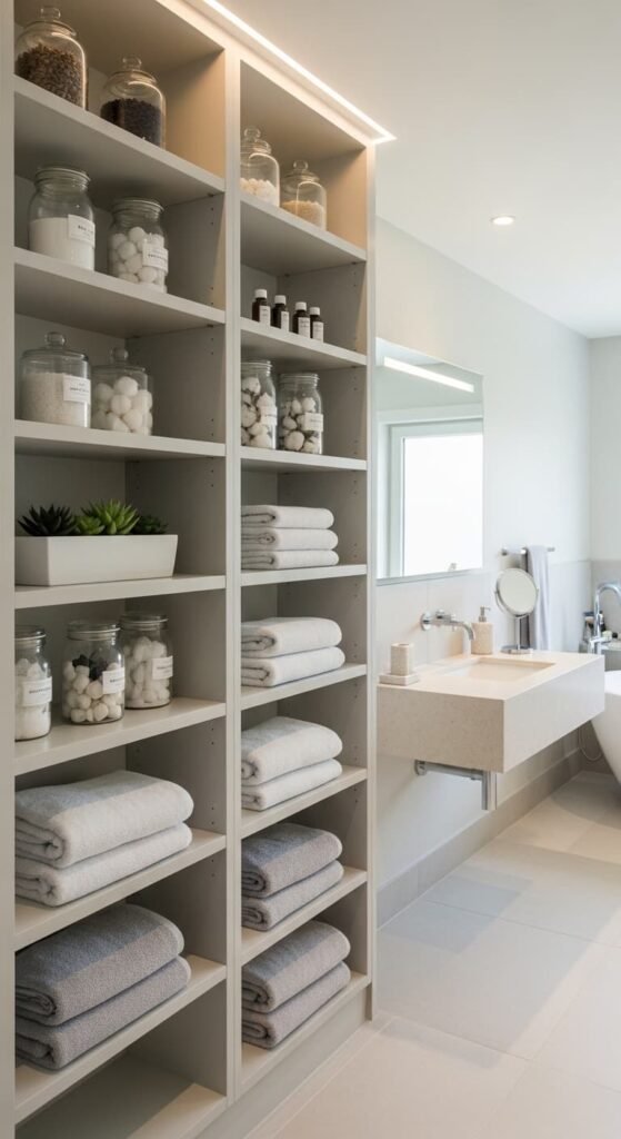 Using vertical space for storage helps reduce clutter in small bathrooms. Tall shelves or cabinets provide ample storage without occupying floor space. This keeps the bathroom organized and visually spacious.
