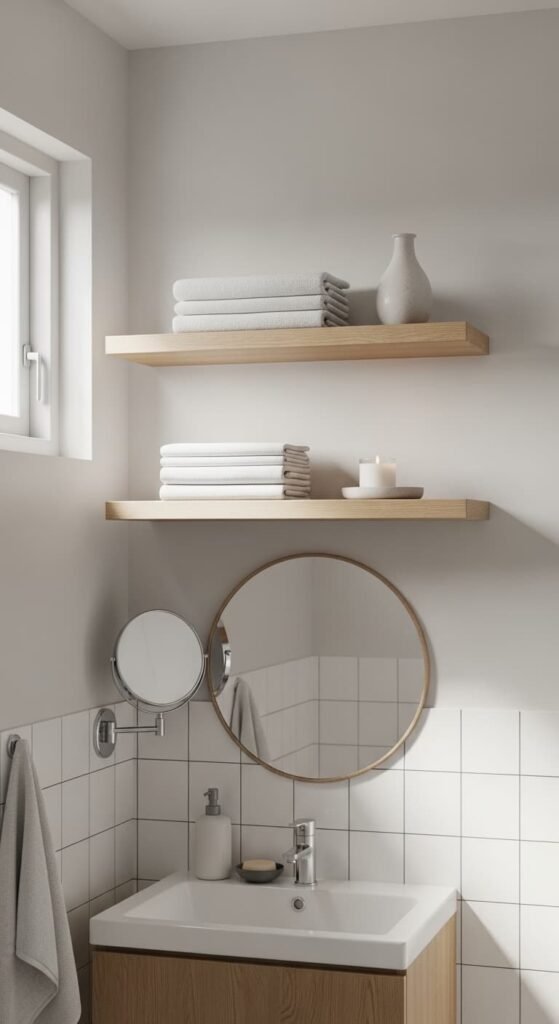 Minimalist floating shelves create a clean, open look perfect for small bathrooms. Their sleek design keeps visual clutter low while offering enough space for essentials. Style them with neutral-toned decor, small candles, and neatly folded towels. Keeping items minimal allows each piece to stand out while maintaining an airy, modern aesthetic that enhances the sense of space.