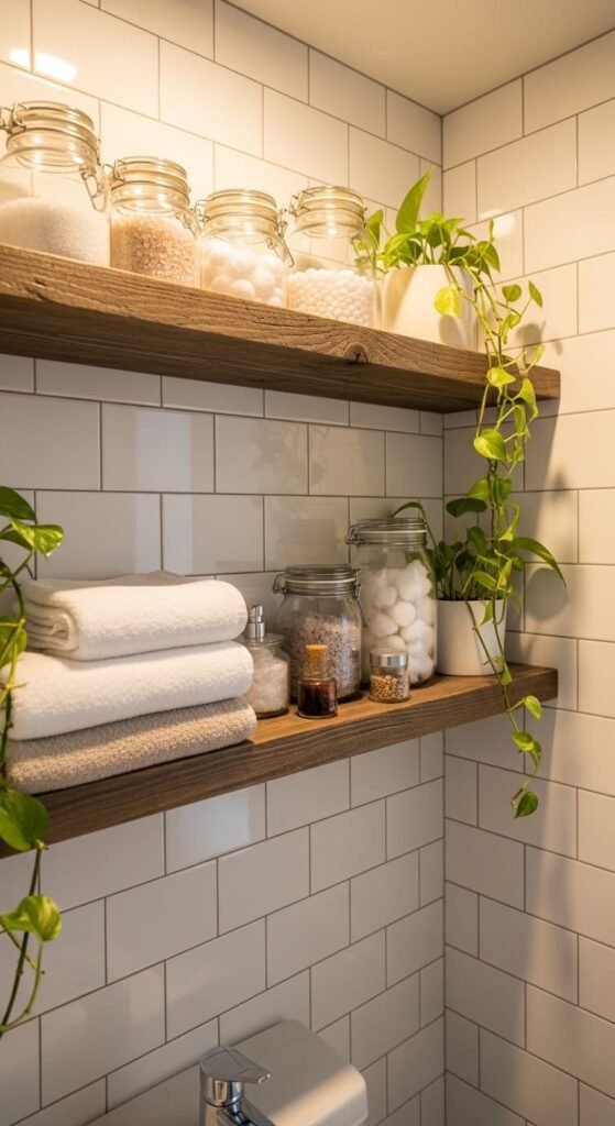 Rustic wooden shelves add warmth and texture to a compact bathroom. The natural grain contrasts beautifully with modern tiles, creating a cozy yet stylish look. Decorate with woven baskets, jars, and greenery to enhance the rustic aesthetic. This design brings character while still maintaining functionality in a small space.
