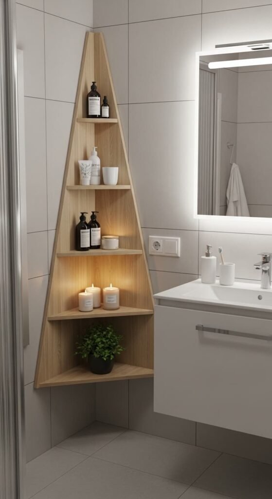 Corner shelves utilize often-overlooked spaces, making them ideal for small bathrooms. These compact shelves fit neatly into corners without obstructing movement. Use them to store toiletries, decor items, or small plants. This smart design maximizes every inch of space while keeping the bathroom organized and visually appealing.