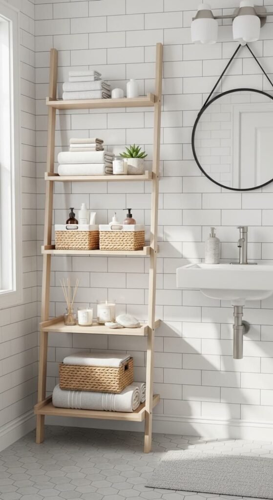 A ladder shelf adds vertical storage while maintaining a lightweight look. Its open design prevents the bathroom from feeling cramped while offering multiple levels for storage. Style each tier with towels, baskets, and decorative pieces to create a layered, stylish display that enhances both function and decor.