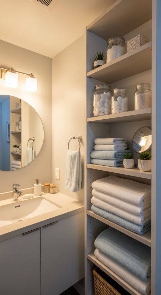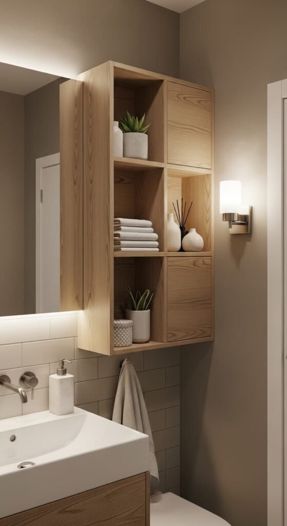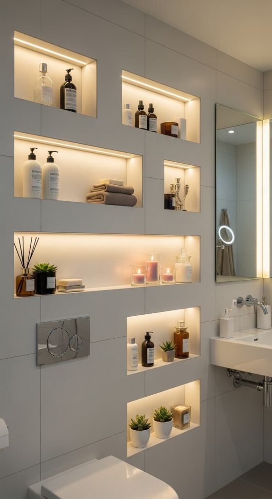 Hidden storage shelves combine practicality with a clean aesthetic. By concealing clutter behind minimal designs, they keep the bathroom looking neat and spacious. This solution is perfect for maintaining organization without sacrificing style in compact bathrooms.