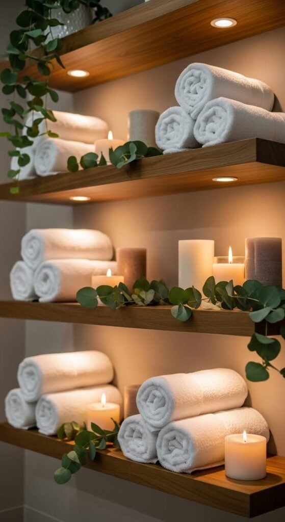Open shelves styled like a spa create a relaxing and organized bathroom atmosphere. Rolled towels, candles, and natural elements like eucalyptus add a calming touch. This approach combines practicality with aesthetics, turning simple shelves into a decorative focal point that enhances the overall ambiance.