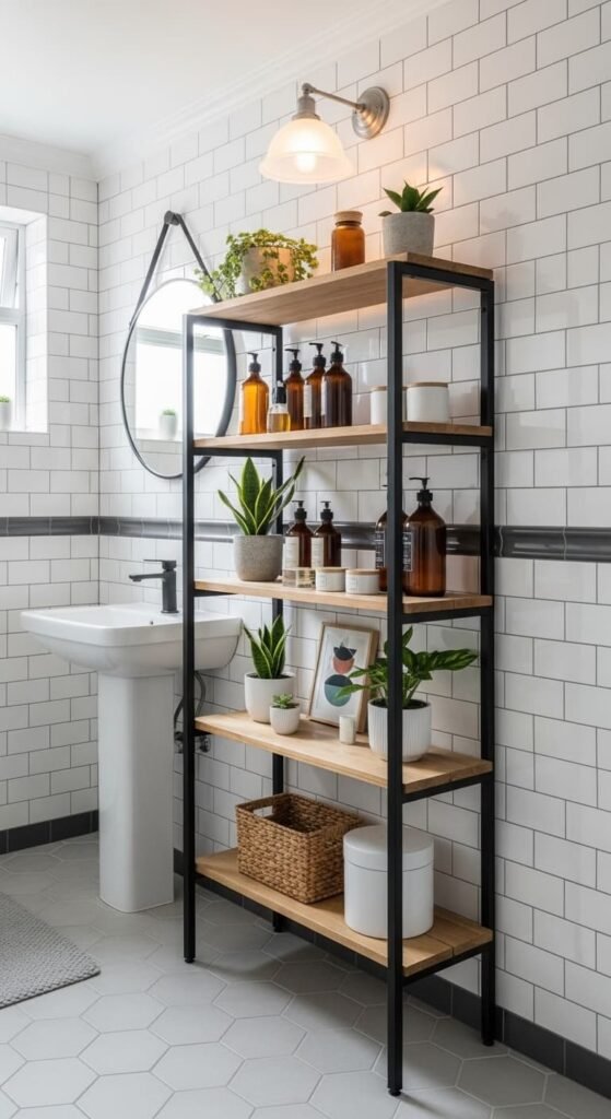 Industrial-style shelves with metal frames add a bold, modern edge to small bathrooms. Combined with wood or glass surfaces, they create a stylish contrast. Use them to display essentials while maintaining a structured, organized look. This design works especially well in contemporary or loft-style interiors.