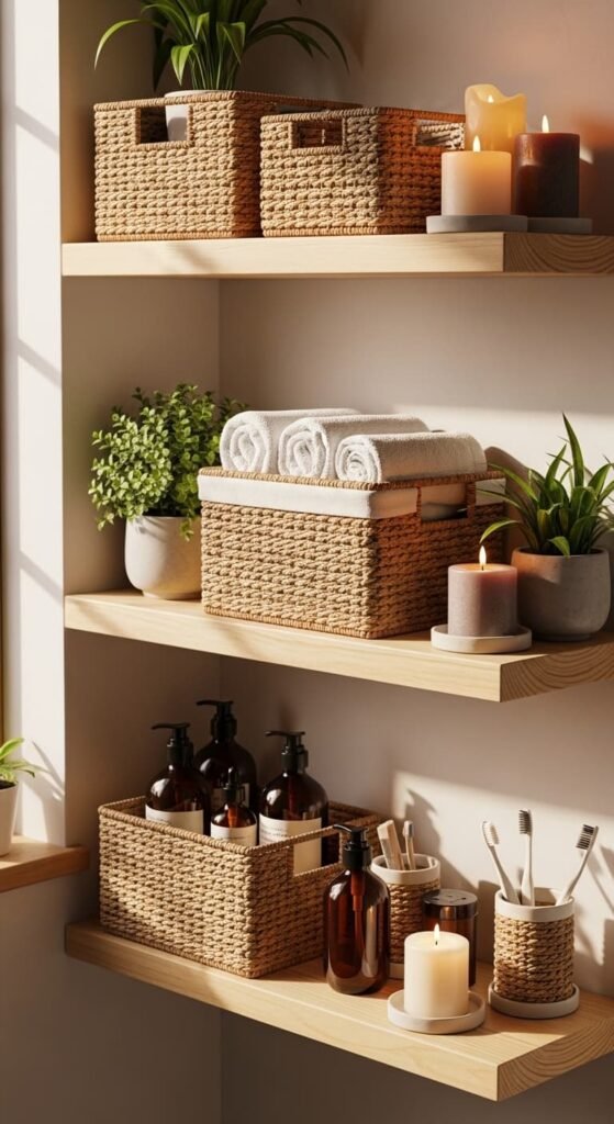 Incorporating baskets into shelf decor adds both style and functionality. Woven baskets help conceal clutter while maintaining a cohesive look. Place them on shelves to store toiletries, towels, or cleaning supplies. This design keeps the bathroom tidy while adding texture and warmth.