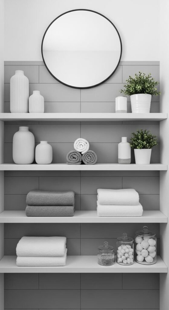 A monochrome color palette creates a cohesive and modern bathroom design. Using similar shades for shelves and decor items keeps the space visually calm and uncluttered. This approach is ideal for small bathrooms, as it enhances the sense of openness while maintaining a stylish appearance.