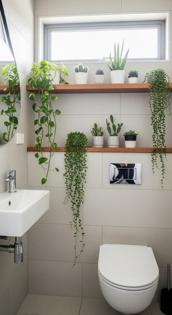 Adding greenery to bathroom shelves brings life and freshness to the space. Small plants or trailing vines soften the look of hard surfaces and add visual interest. This simple decor idea transforms functional shelves into a vibrant and inviting feature.