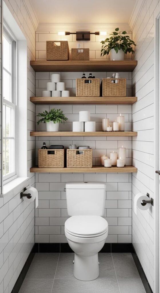The space above the toilet is often unused but perfect for shelving. Installing shelves here provides extra storage without taking up floor space. Decorate with baskets, plants, and rolled towels to keep the area organized yet stylish. This vertical solution maximizes functionality while maintaining a visually balanced and uncluttered bathroom design.