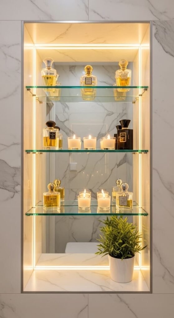 Glass shelves are perfect for small bathrooms because they maintain visual openness. Their transparent design prevents the room from feeling heavy or crowded. Style them with minimal decor like perfume bottles, candles, and small greenery. This elegant solution blends storage with sophistication while keeping the bathroom light and spacious.