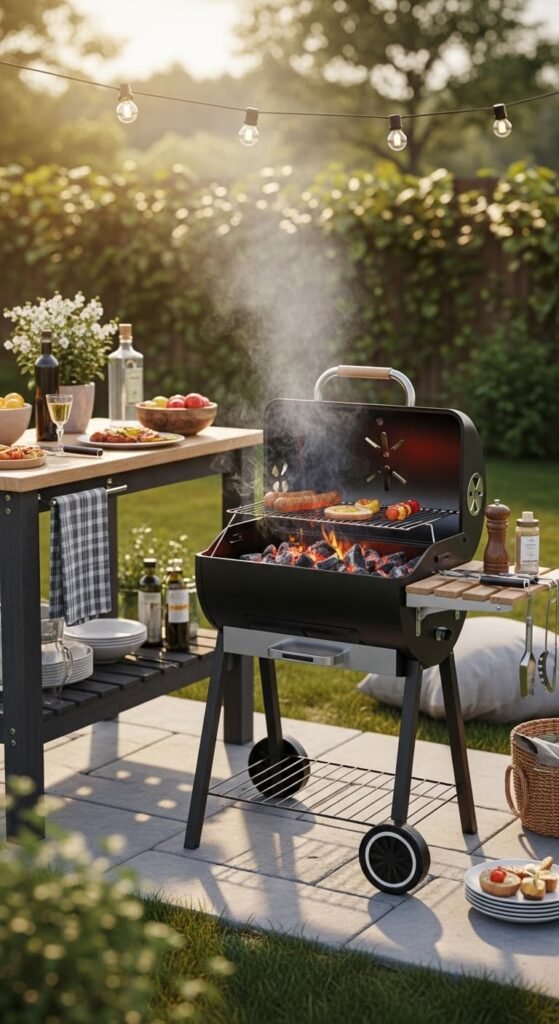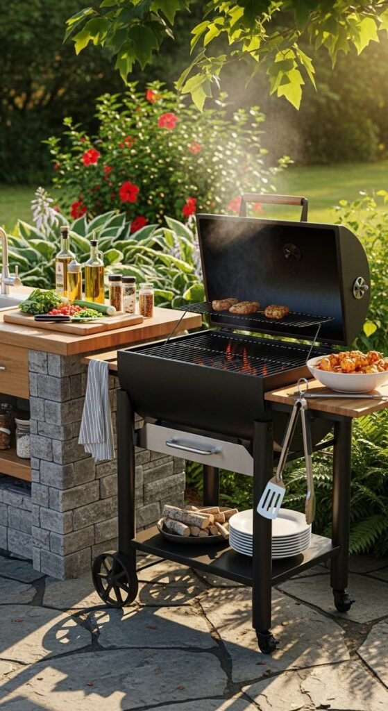 A portable BBQ grill cart combines mobility and affordability. It includes wheels for easy movement and a compact cooking surface. This design allows flexible placement in any outdoor space while offering a complete grilling experience on a budget.