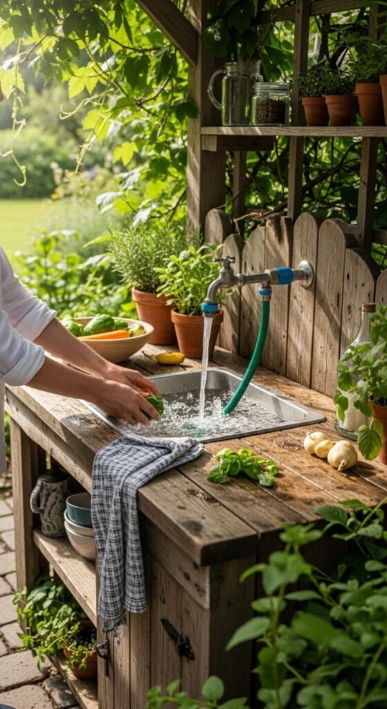 A simple outdoor sink connected to a garden hose is a low-cost upgrade that improves convenience. It makes cleaning vegetables, dishes, and hands much easier without needing expensive plumbing systems.