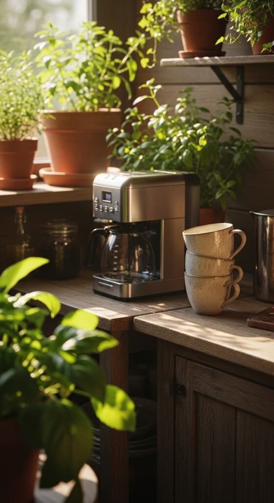A small coffee maker or manual brewing setup adds charm to an outdoor kitchen. It’s affordable and perfect for morning relaxation. Pair it with a small table and seating for a cozy outdoor experience.