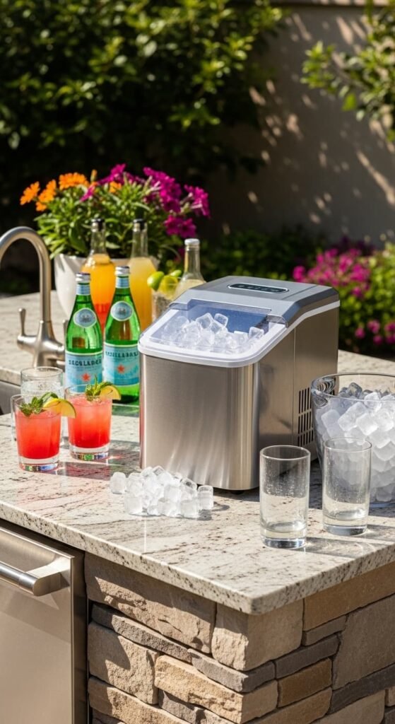 A portable ice maker is an affordable luxury for outdoor kitchens. It produces ice quickly for drinks and entertaining guests. Its compact size makes it easy to store and use in small spaces.