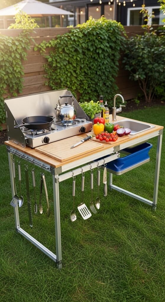 A foldable cooking station with built-in burners or space for appliances is ideal for saving space and money. It can be stored easily when not in use and provides a complete cooking setup for outdoor meals.