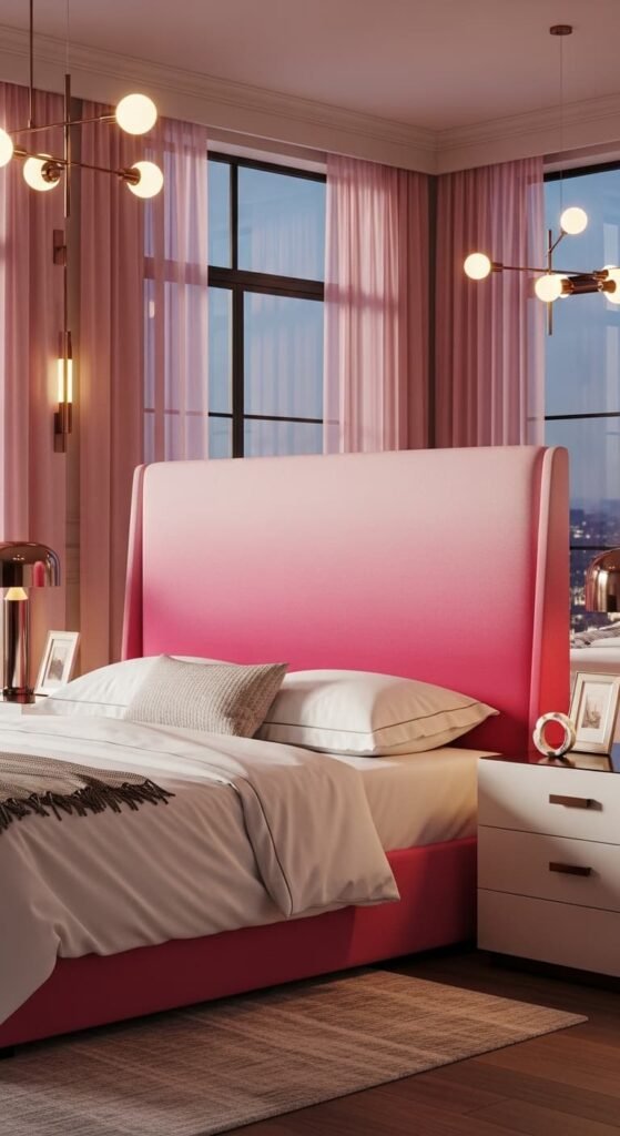 Featuring a headboard that fades from blush to deep rose in ombre effect, this bed adds artistic flair and modern drama. Paired with simple bedding and pops of metallic accents, it creates a chic focal point in upscale contemporary bedrooms.