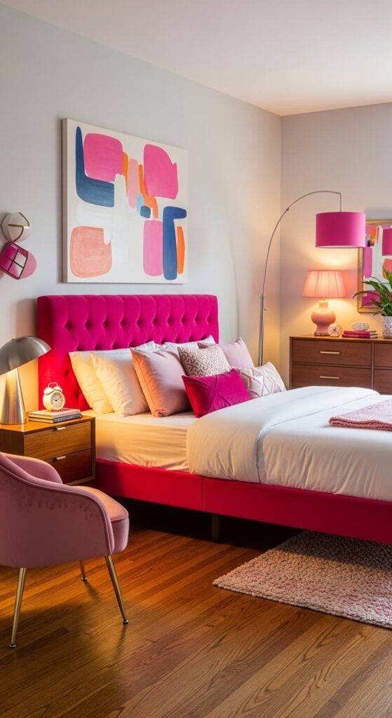Bold hot pink upholstery makes a confident statement in modern eclectic interiors. Balanced with neutral walls and mid-century modern furnishings, it brings creative energy and personality to any contemporary bedroom.
