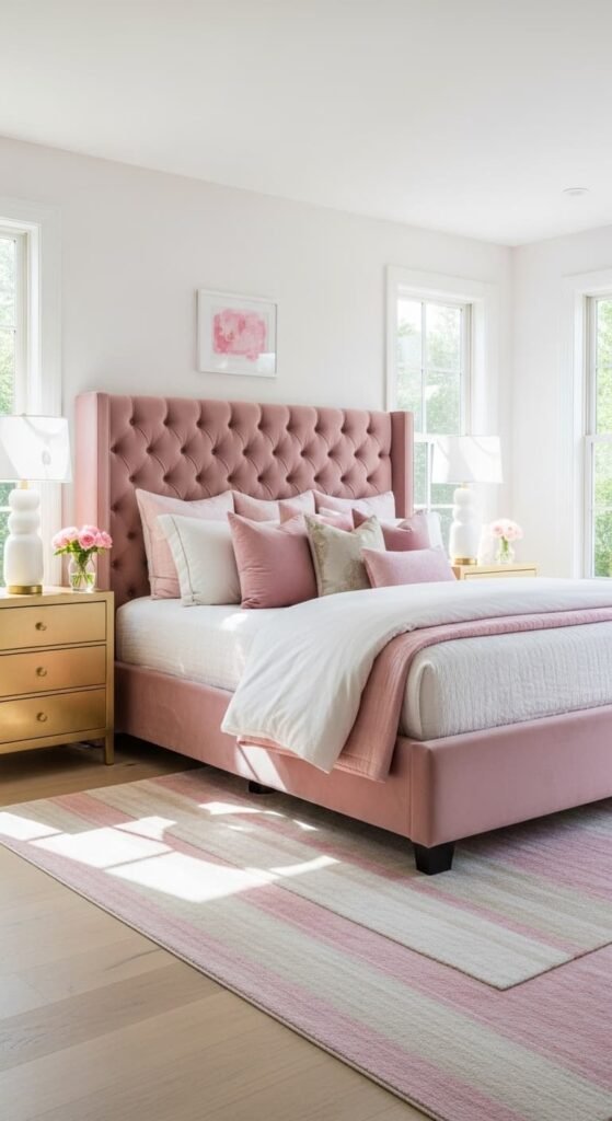 A luxurious blush-pink velvet upholstered bed anchors any modern bedroom. The tufted headboard adds soft texture and rich dimension, while clean lines keep it contemporary. Paired with light neutral linens and gold accent nightstands, this design elevates cozy elegance — perfect for master suites that merge refined glamour with inviting comfort.