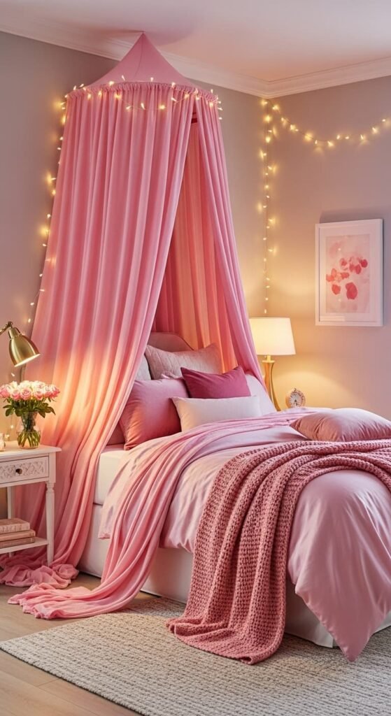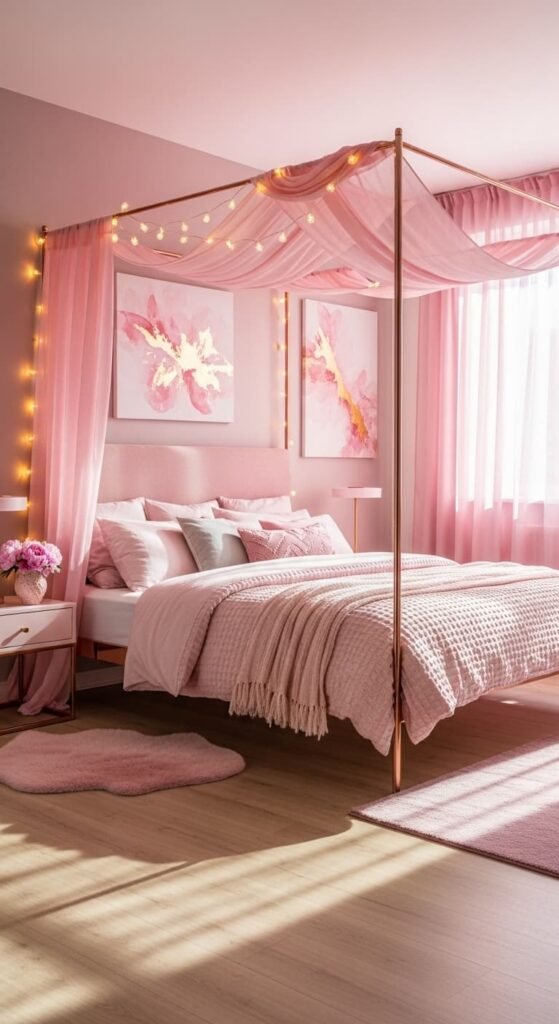 A soft romantic canopy bed robed in delicate pink continues beyond the frame, wrapping the space with draped fabric and ambient light. It creates a fairy-tale retreat effect while remaining refined and modern in execution.