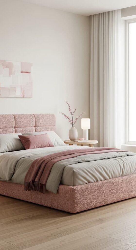 A clean-lined pastel pink platform bed brings gentle color to minimalist interiors. Its low profile and subtle finish allow the form to remain sleek and modern, while soft white and natural linen bedding keeps the space fresh and serene — ideal for simple, contemporary bedrooms.