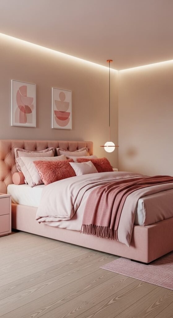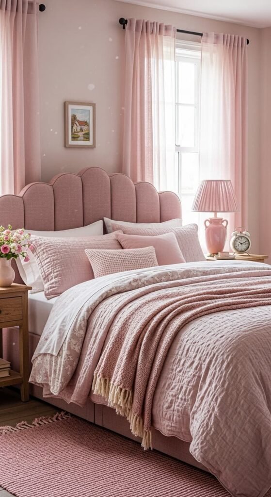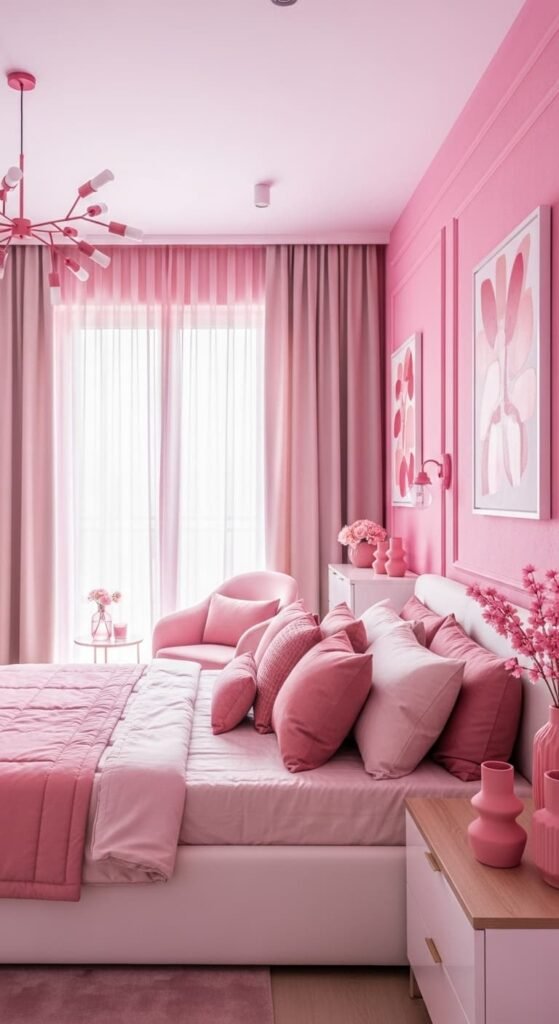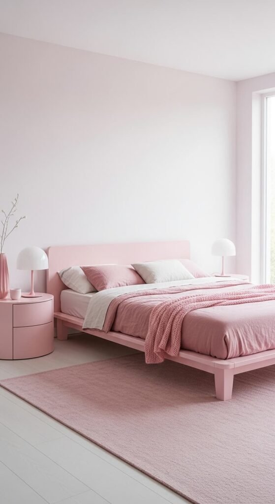 A monochrome pink bed and coordinated decor create a bold, cohesive look. Different shades and textures of pink — from blush to deep rose — provide visual depth without clutter, making this ideal for fearless modern interiors.