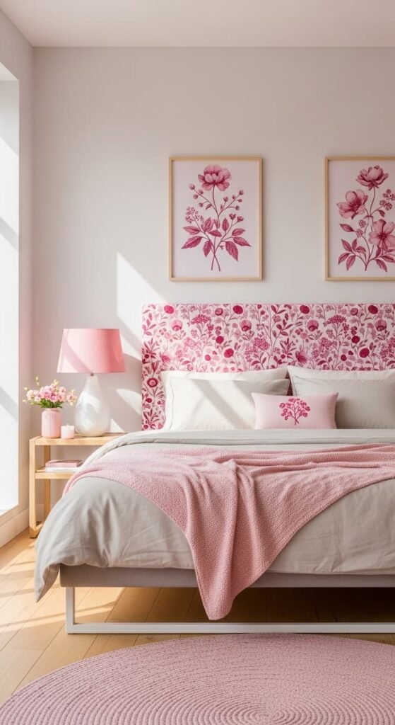 A custom floral pink headboard adds artistic flair while grounding a modern bed frame. Paired with soft neutrals and gentle décor, it bridges the gap between bold pattern and sophisticated modern design.
